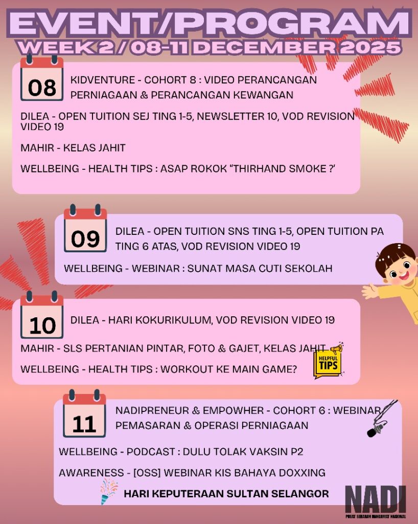 Bermula 8โ11 Disember, NADI hadir dengan rangkaian program penuh ilmu, kemahiran & kesedaran untuk semua lapisan komuniti. Setiap hari ada aktiviti yang berbeza โ setiap hari peluang baharu untuk berkembang!